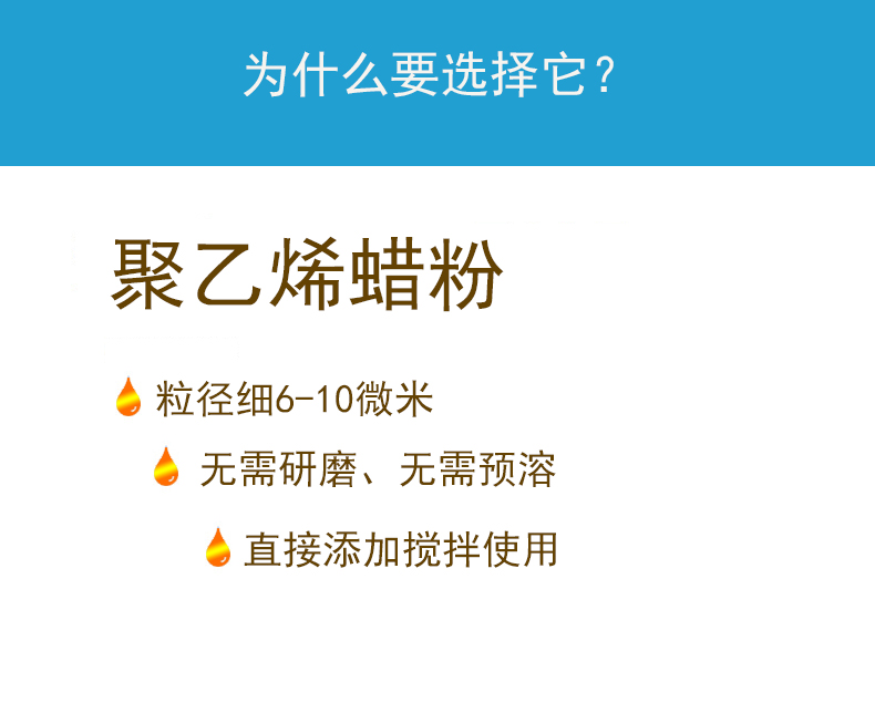 可应用于任何种类的油墨中以提高抗涂擦性,球状颗粒外观最大程度在减少印刷表面的滑动磨擦,对油墨薄膜的光泽几乎没有任何影响、均匀的细度使其可与颜料一同分散,可在室温之下以分散体或浓缩膏状体的形式加到油墨中,亦可直接加入搅拌而不需要溶剂或加热。