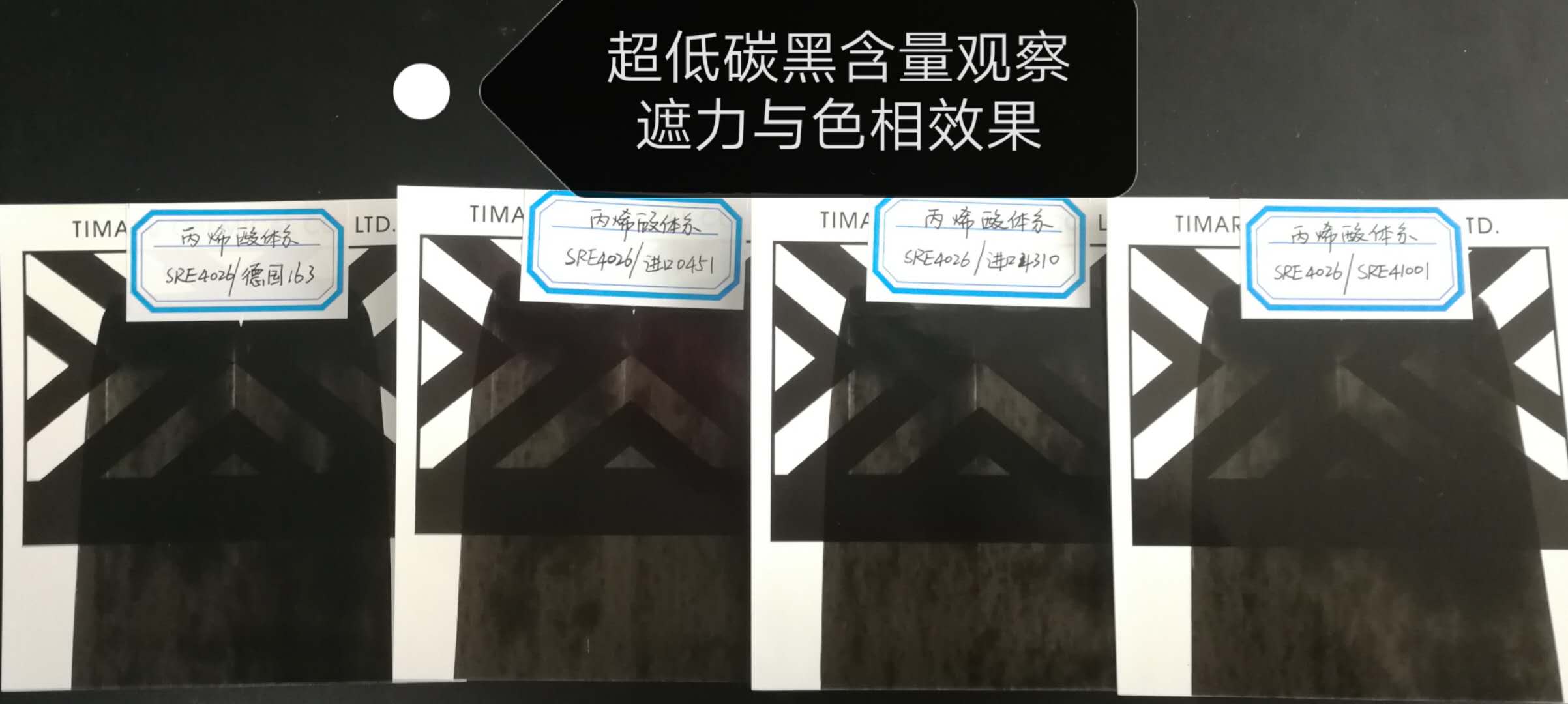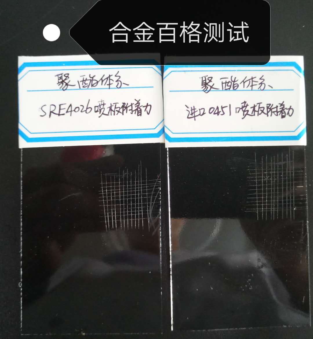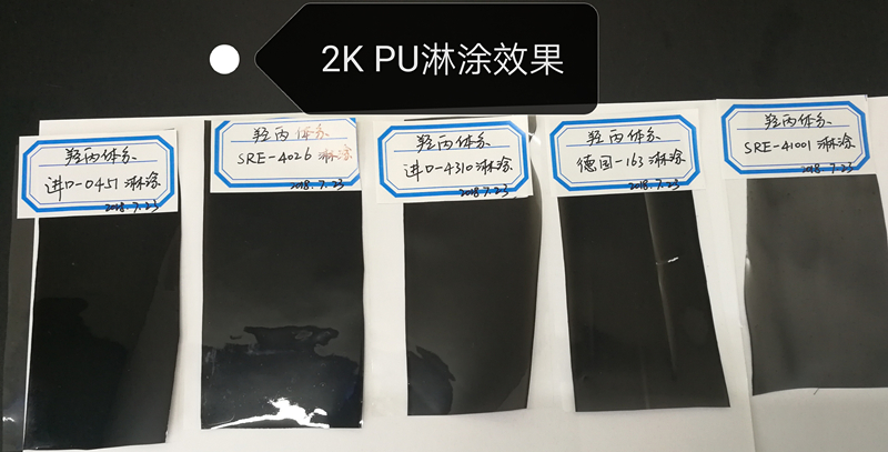 将上述第5项中三种体系配制好的黑色漆5份分别加入对应的白色漆1份,配制成灰色漆。2K PU灰色漆加入相应适量的固化剂N3390。然后分别用100微米涂布器对比拉涂在黑白卡纸上,以观察其着色力强弱。
