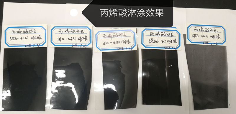 ![]() ![]() ![]() 7、黑色浆的淋涂试验 将1克黑色浆加入到9克各自对应体系的光油中,并加入5g稀释剂,充分搅拌振荡15分钟左右,然后淋涂在透明的PET膜上,于60℃烘烤1小时后观察其光泽、絮凝、起粒、透明度、展色力等。用这种方法可以评价颜料在树脂体系中的稳定性。结果如表