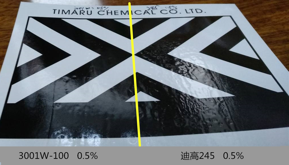 可以看出明显SRE-3001W-100润湿流平性优于迪高245,另两者同时往大添加至0.8%,同时出现反效果,可见明显出现缩孔或缩孔增加。添加性状区别,迪高245添加后出现粘度有上升,流动性降低的情况。
