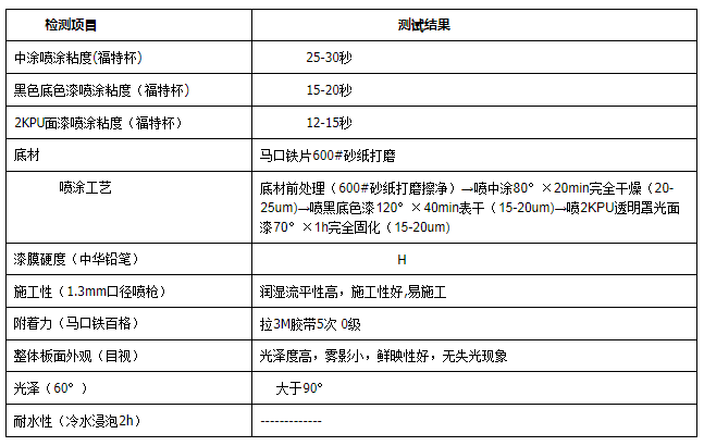 4.4 WS-16中涂与2KPU底色漆和2KPU透明面漆配套后,各项性能都很好,耐水性、漆膜硬度、面漆光泽度都非常好。