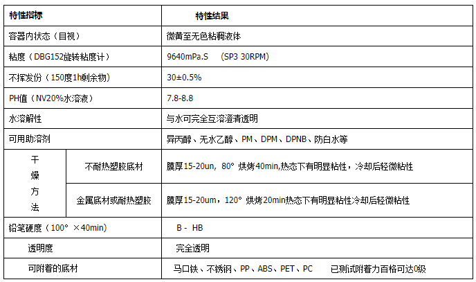 4.1 WS-16是一款水溶性很好的水性树脂,也具有很好的醇溶性,不需加入助溶剂即可与水完全互溶,环保性能相当高,非常符合当今国内、国际对涂料的环保要求,对涂料生产和施工环境人员的身体保护有很大帮助,对大部分金属和非金属底材如:铁、铝、不锈钢、电镀底材、ABS、PC、PP、PET有很好的附着力。