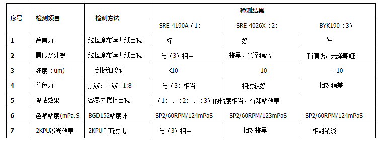 从本实验黑浆的对比数据得出结论:SRE-4026X的分散效果在三个分散剂中相对较好,SRE-4190A与BYK190的性能相当。为了后续实验得出较好的实验结果,选用SRE-4026X做本实验后续实验的分散剂。