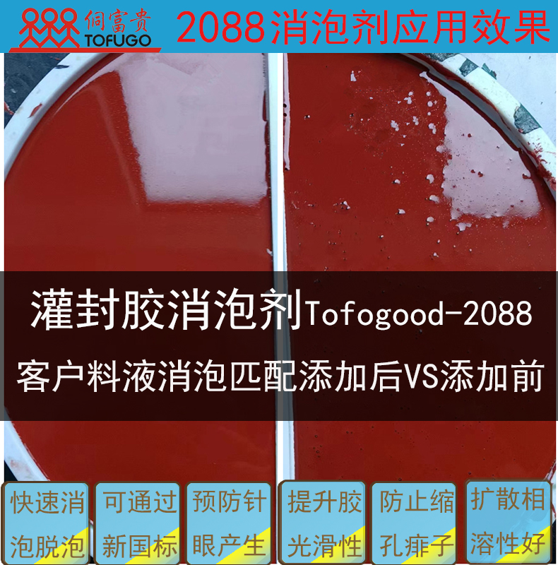如何用Tofogood-2088替代某进口的088呢?首先,我们需要了解2088消泡剂的化学成分和特性,以便更好地选择适合的添加量和使用方法。在实践中,我们可以尝试通过调整添加量、使用方式以及工艺条件等方式,逐步摸索出最适合的配方和工艺。在环氧或聚氨酯灌封料中,它的添加量建议0.3-1%就可以,在丝印油墨或UV体系中,添加量建议仅需0.1-0.5%。