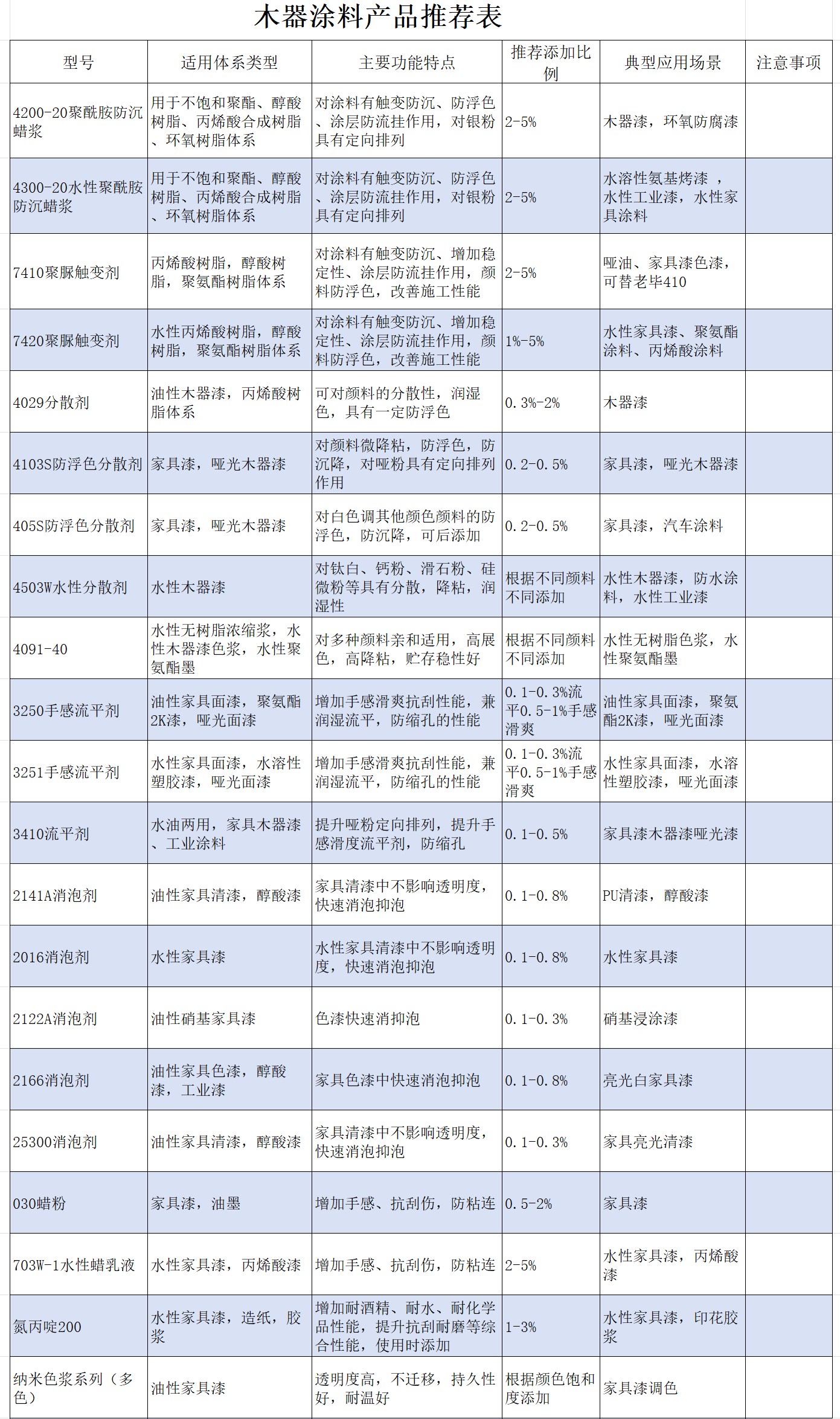 木器漆助剂的选择需结合涂料类型(溶剂型 / 水性、PU/UV/NC)、基材特性(软木 / 硬木、含油脂与否)、施工工艺及最终性能需求(如高光 / 哑光、室内 / 户外)。
