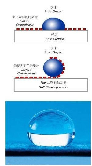 疏水效果:具有荷叶般的奇特疏水效果,使其强抵卸水的侵蚀,水珠连带污垢和其他污染物一起